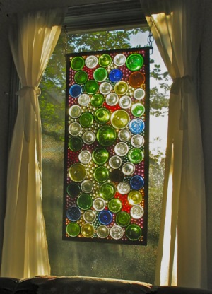 Çeşitli ebat ve renklerde ki cam şişelerin dip kısımları çıkarılarak vitray görünümlü bir pano oluşturulmuş. Güneş ışıkları vurduğunda harika bir görüntü oluşturacağından şüphem yok. Ancak bu sıradan bir hobi çalışması değil hem tehlikeli hem de özel cam kesici aletlerle çalışmak gerekiyor. Kaynak