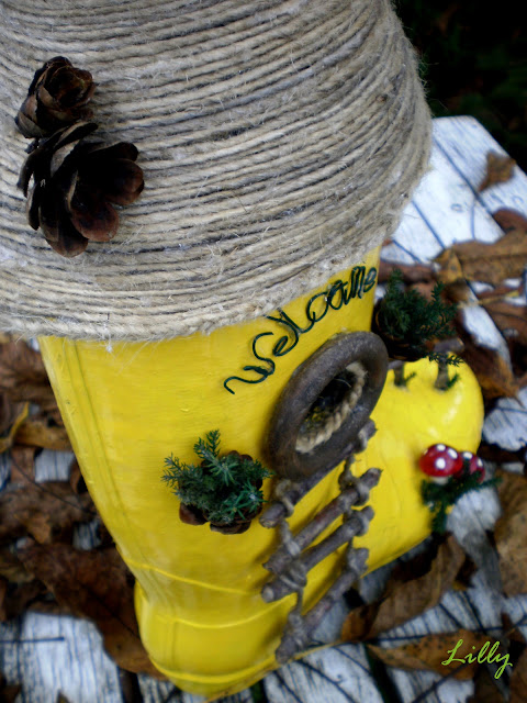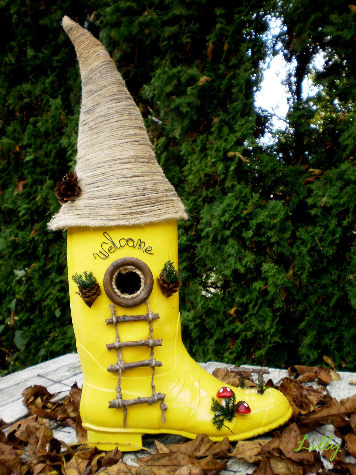 Eskimiş lastik çizmenin böylesine güzel bir geri dönüşüme uğrayıp estetik bir kuş evine dönüşebileceği aklınıza gelir miydi? angelsdustandfeathers bloğunun sahibesi düşünmüş ve uygulamış. Bahçe dekoru için oldukça estetik bir görünüm.