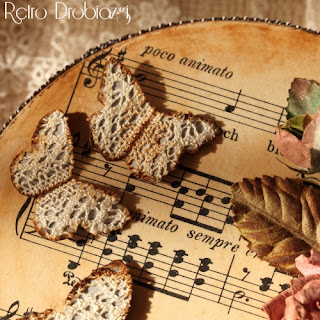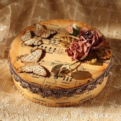 Yuvarlak ahşap kutu ilk etapta sararmış müzik temalı kağıtlar kullanılarak dekupaj tekniği ile kaplandıktan sonra dantel fisto, dantel kelebekler ve kurumuş bir gül dalı ile süslenmiş. Çok şık ve çok romantik buldum.