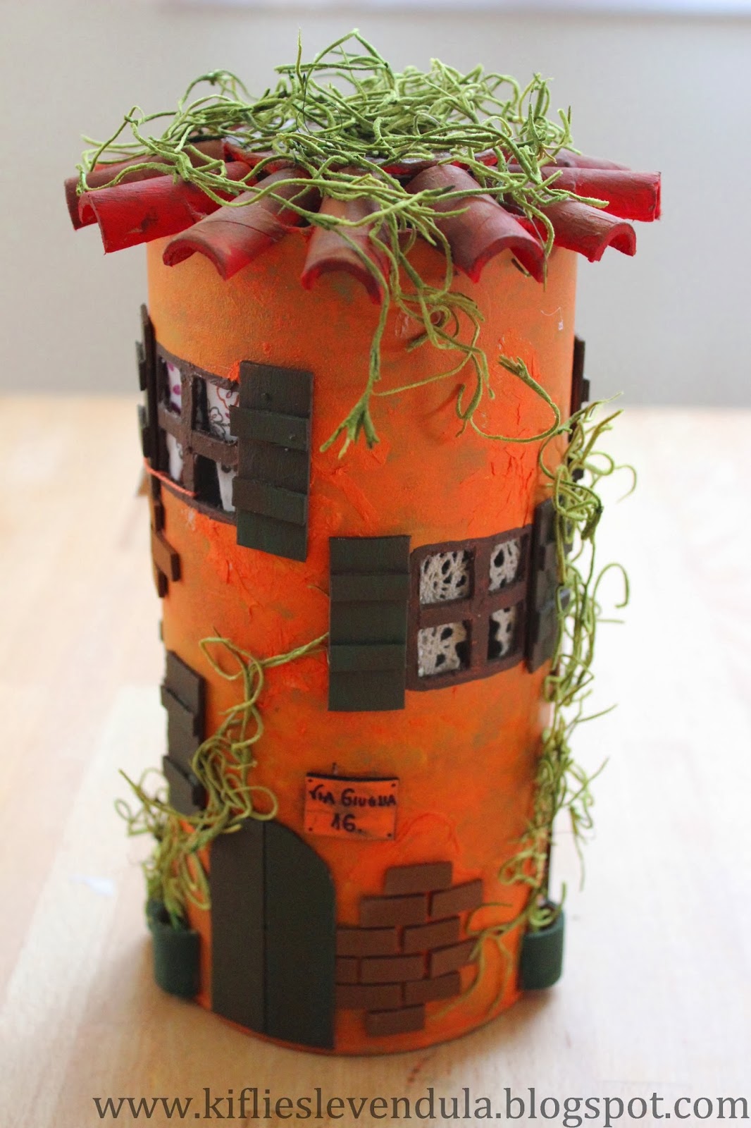 Kuruduktan sonra kesici ile oyulan pencereler ve yine kartondan yapılan panjurlarla silindir kutu gerçek bir akdeniz evi görüntüsüne kavuşmuş.