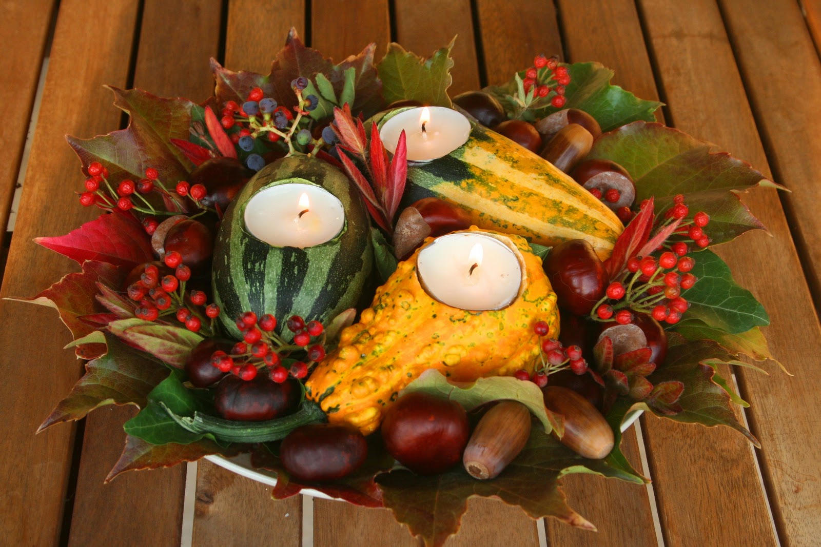 Mumun sığacağı büyüklükteki dairesel bölümün, kalemle çizilip oyulmasıyla hazırlanan kabaklar, renkli sonbahar yaprakları ve meşe palamudu ile süslenmiş tabağa yerleştiriliyor. Bu hoş fikir için lavantalı kızın bloğuna bakabilirsiniz.