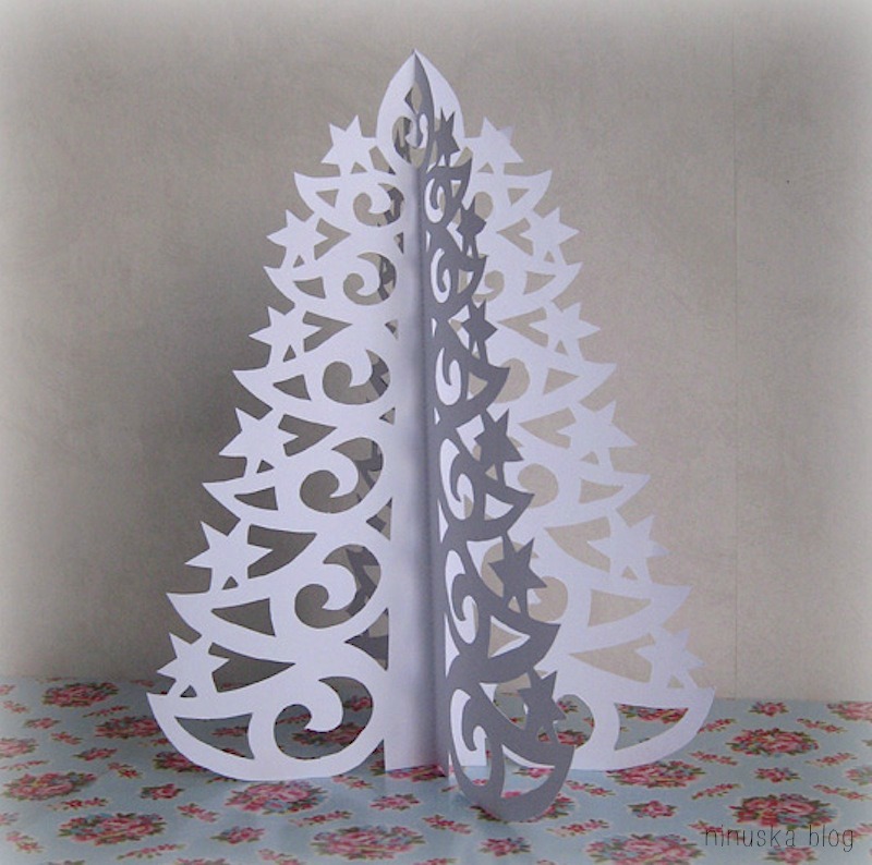 Çeşitli renk ve desende kağıt kullanılarak yapılmış dekoratif yeni yıl ağacı projesi için istediğiniz boyutta kağıt kullanabilirsiniz. Daire şeklinde kesilmiş kağıt, makasla spiral hale getirildikten sonra cımbız ya da quiling kalemi ile dışarıdan içe doğru sarılıyor. (Ayrıca bu işlemi parmaklarınızla da yapabilirsiniz.) Merkeze eklenen tutkal yardımıyla sabitlenen çiçek, konik şekildeki strafora, tutkal tabancasıyla yapıştırılıyor. Detaylar için kaynak.