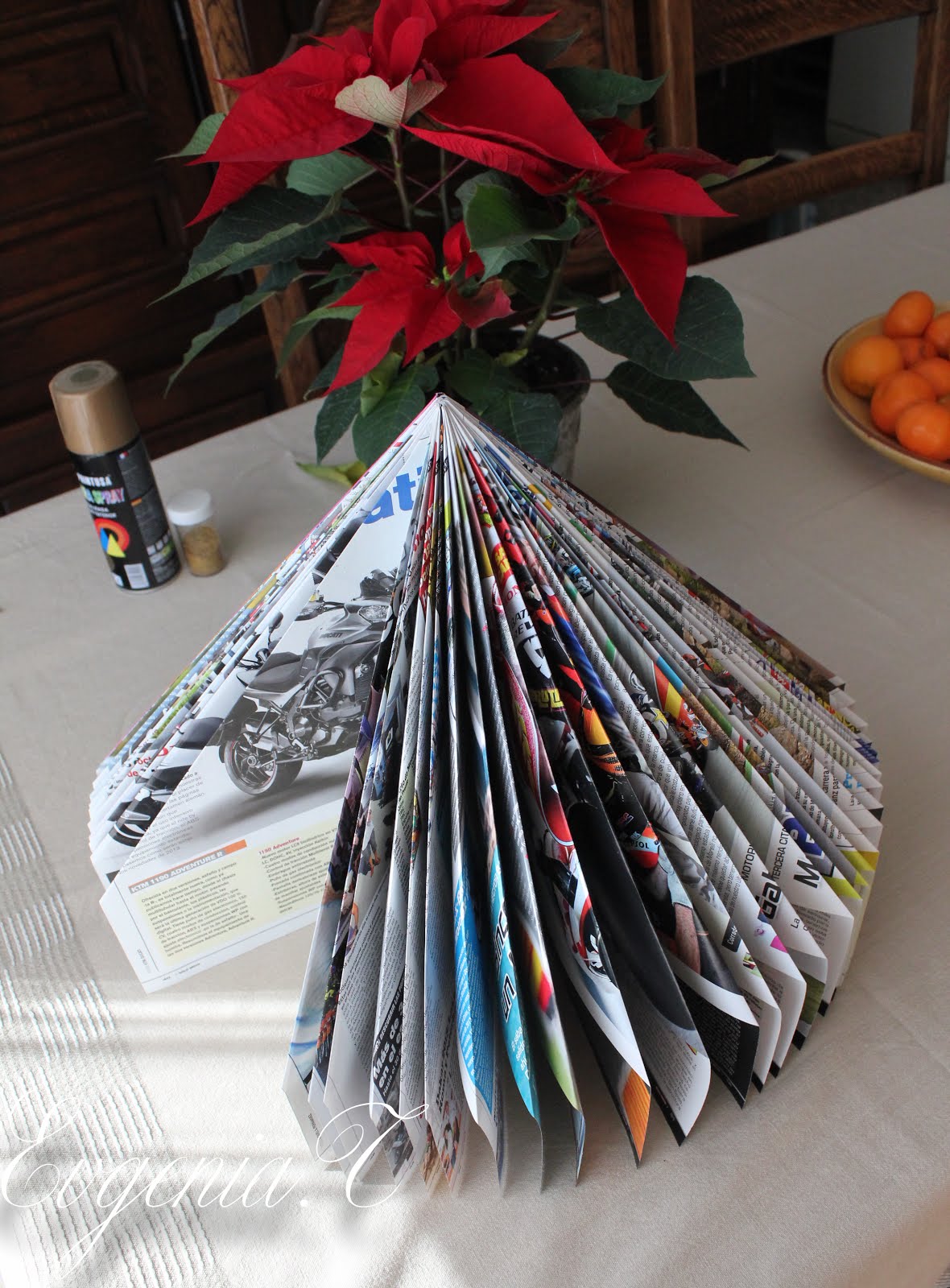 Dergi yapraklarından yapılan bu yılbaşı süsleri metalik sprey boyayla renklendirilmiş. Çok az masrafla elde edebileceğiniz bu dekoru çocuklarınızla da yapabilirsiniz. Ayrıntıla Evgenia'nın bloğunda.